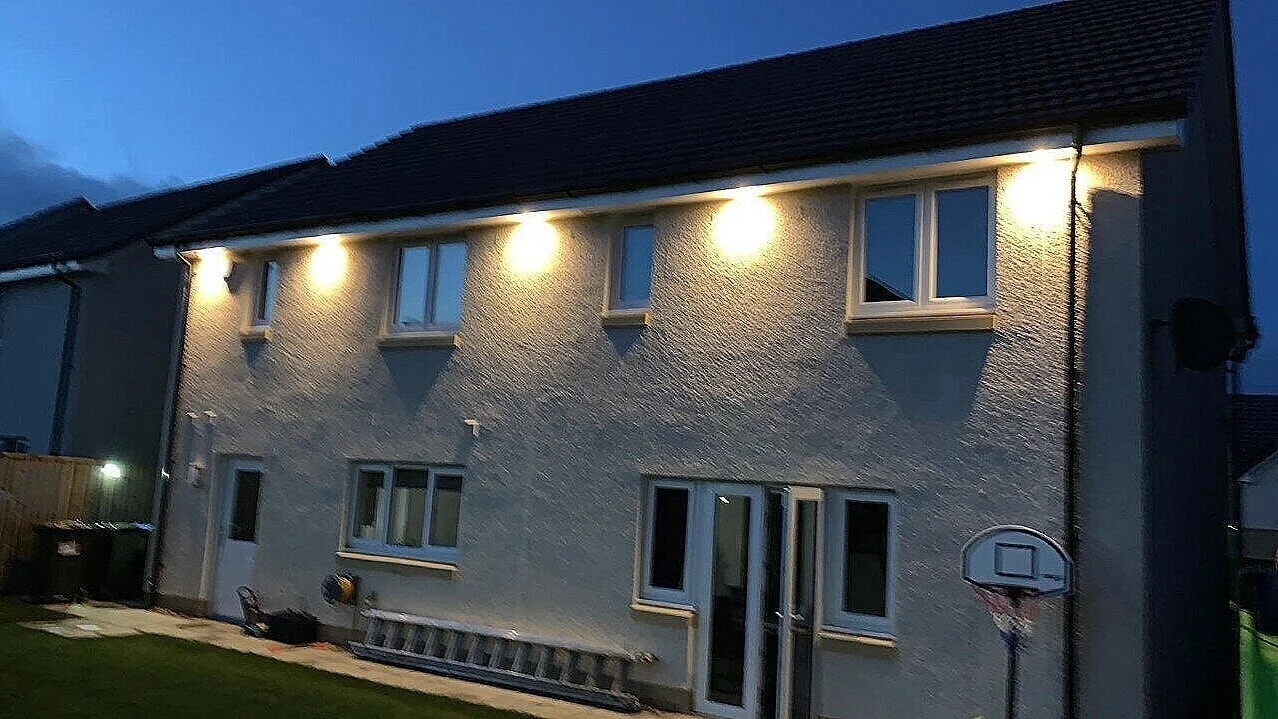 External soffit downlights wired and fitted front and back of this detached family home.